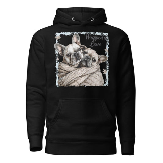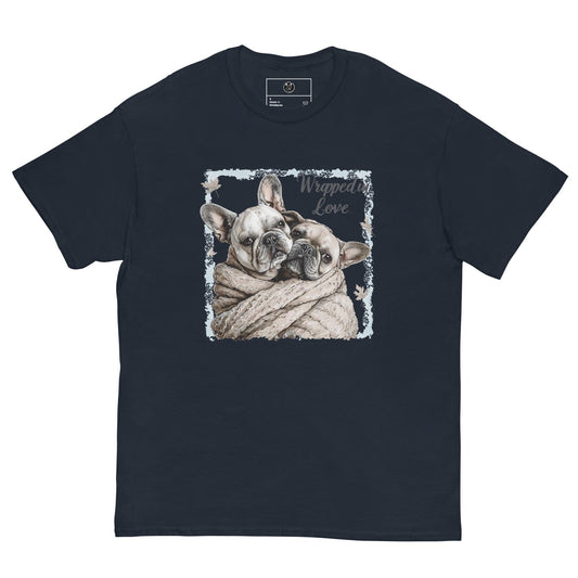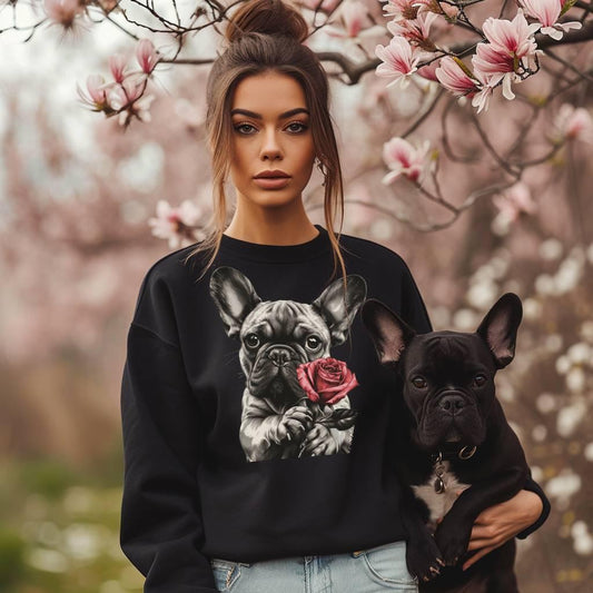 Indulge in the whimsy of love-themed designs featuring adorable French Bulldogs expressing affection in every stitch. Whether it's a Frenchie holding a delicate rose, or two French Bulldogs snuggled up under a blanket with the caption "Wrapped in Love", each garment in this collection is a testament to the unconditional love shared between humans and their beloved Frenchie's.