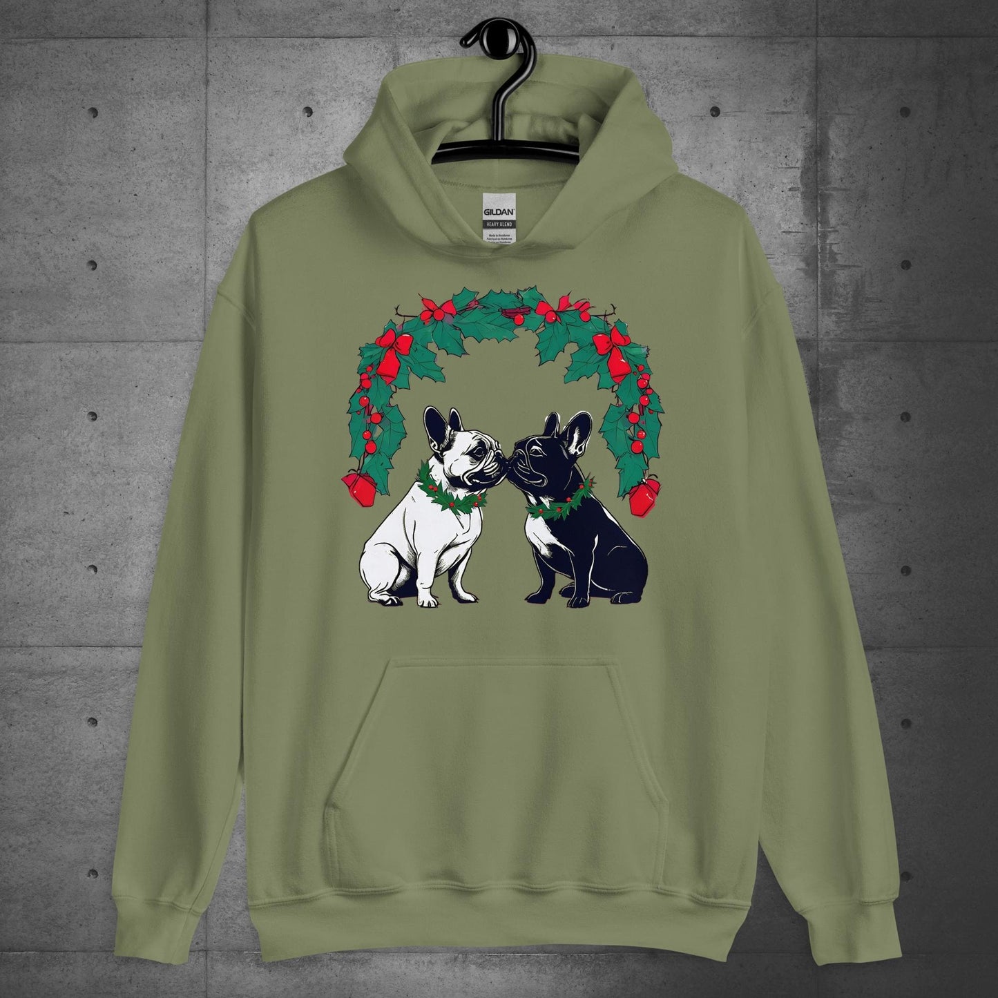 Spread holiday love with our “French Bulldog Christmas Romance Under Mistletoe” Unisex Hoodie! Featuring a pair of French Bulldogs sharing a tender moment under a beautifully designed mistletoe wreath, this hoodie blends holiday charm with cozy warmth. Perfect for gifting, parties, or casual festive outings, it’s a playful and heartwarming addition to your winter wardrobe. Celebrate the season in style with this must-have for Frenchie enthusiasts and Christmas fans alike!