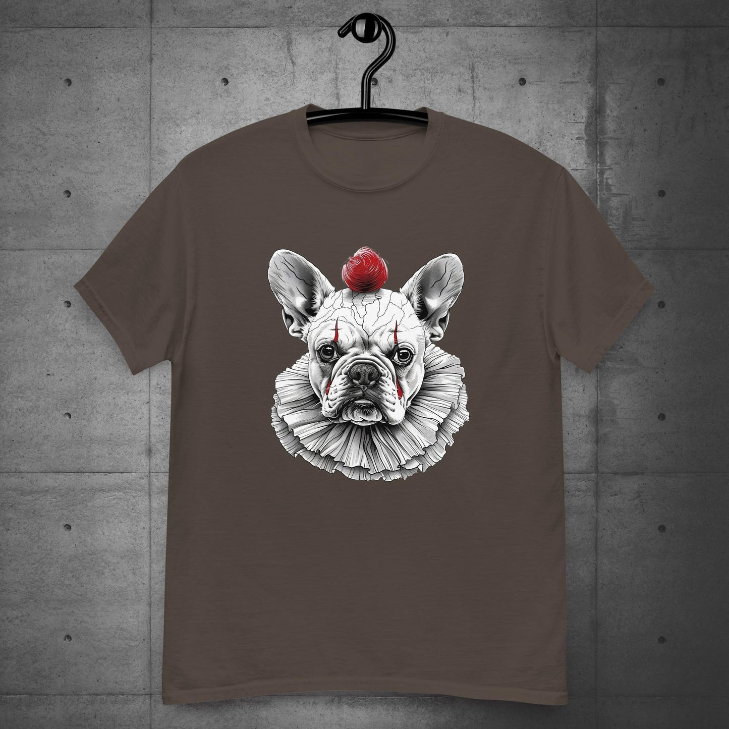 Embrace the spooky spirit with our "Frenchie IT Clown" Unisex T-Shirt! Featuring a hauntingly adorable French Bulldog dressed as Pennywise the Clown, complete with the cracked white makeup, signature red nose, and eerie red lines extending from its eyes. Perfect for Halloween or horror fans, this design combines cute and creepy in a way that’s sure to make a bold statement. Add this to your spooky season wardrobe and show off your love for horror and Frenchies alike!
