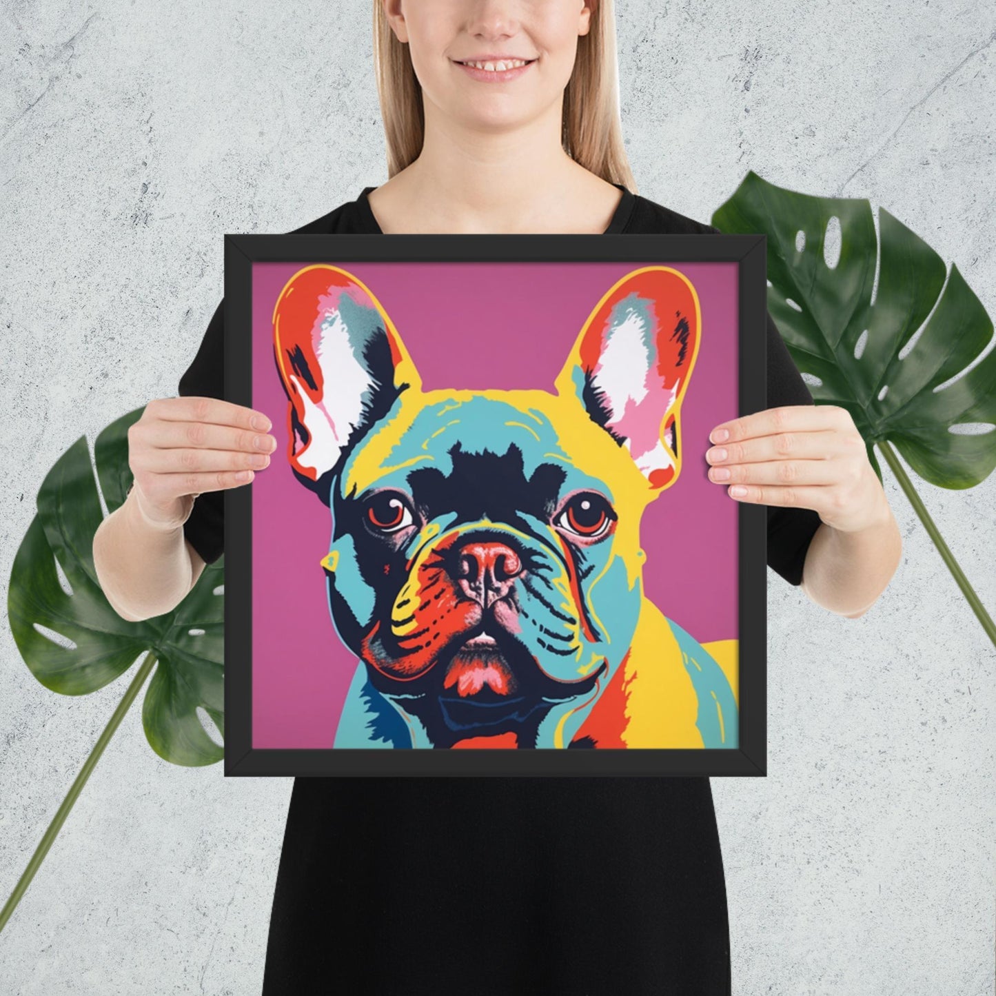 This striking piece is printed on high-quality, durable paper and comes beautifully framed, ready to hang. The 'Pop Palette Frenchie' framed poster effortlessly blends the appeal of contemporary art with the playful charm of this popular breed, making it a standout addition to any room or office.