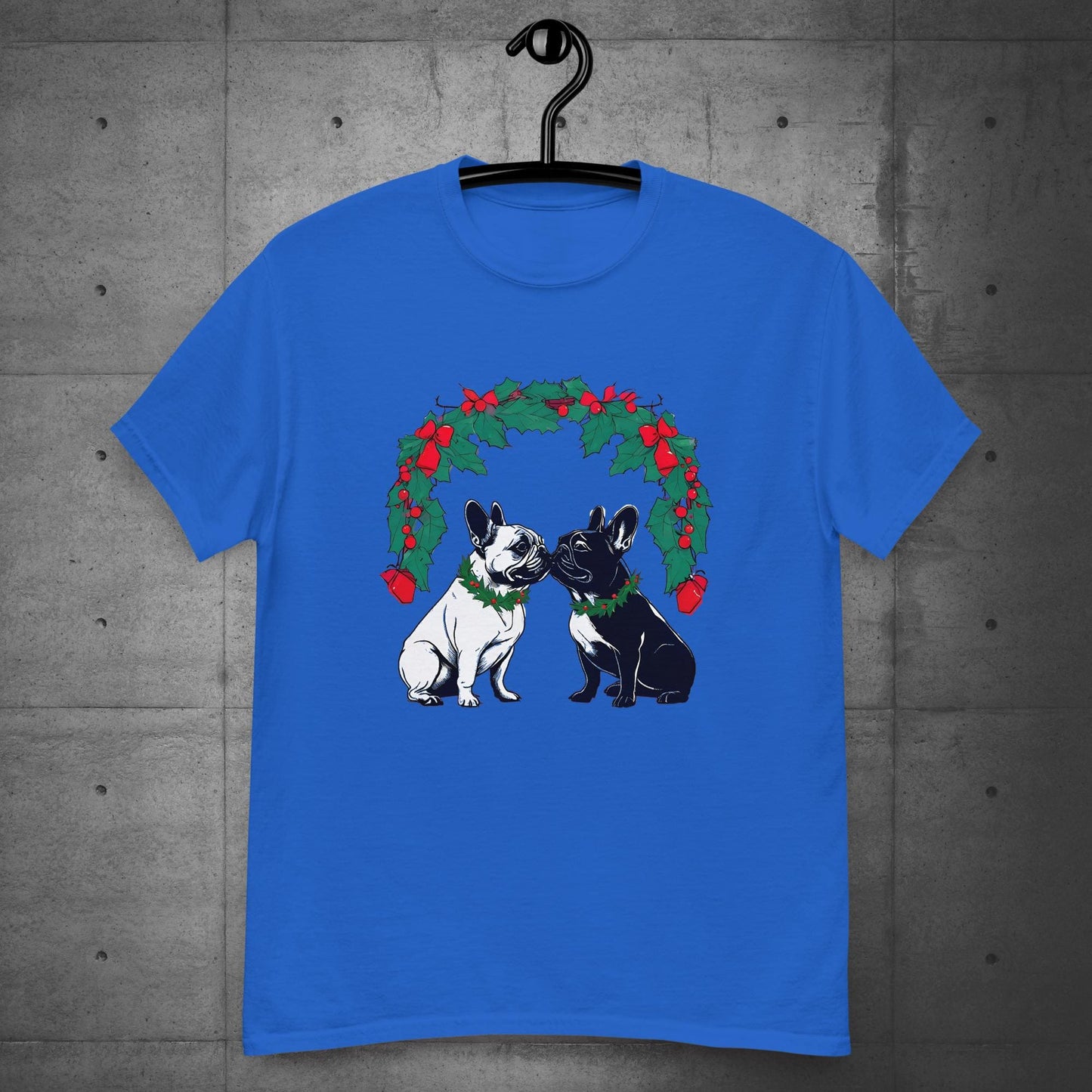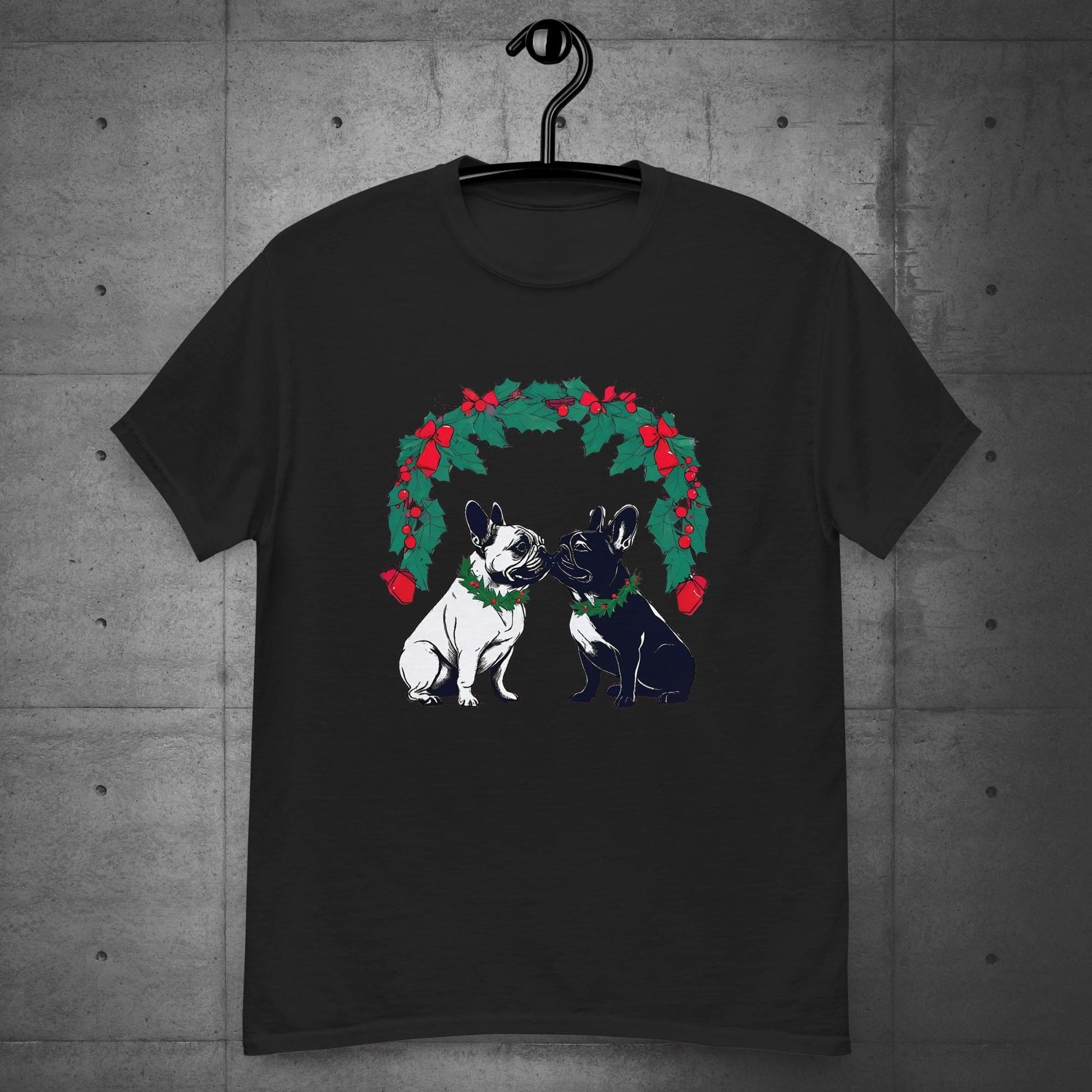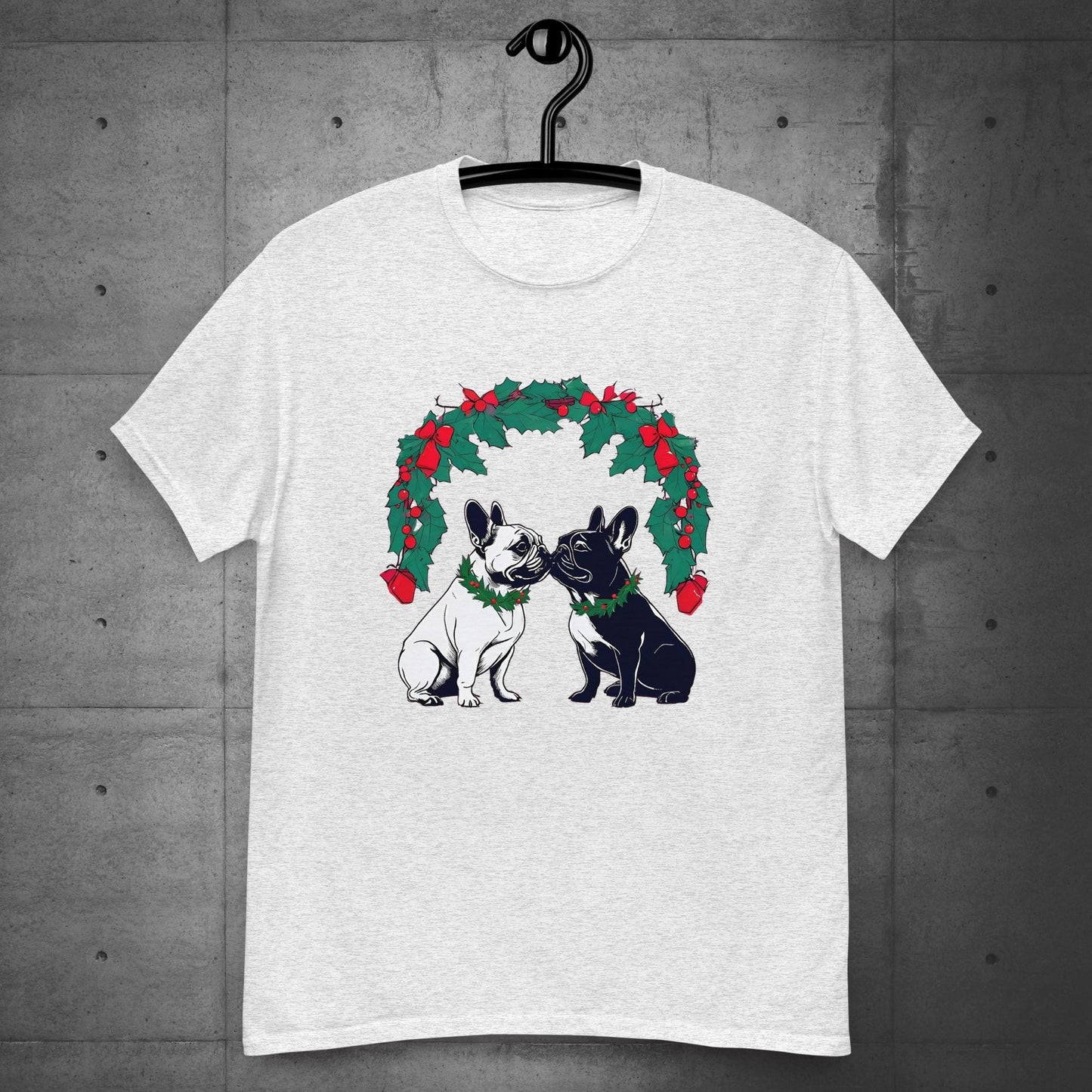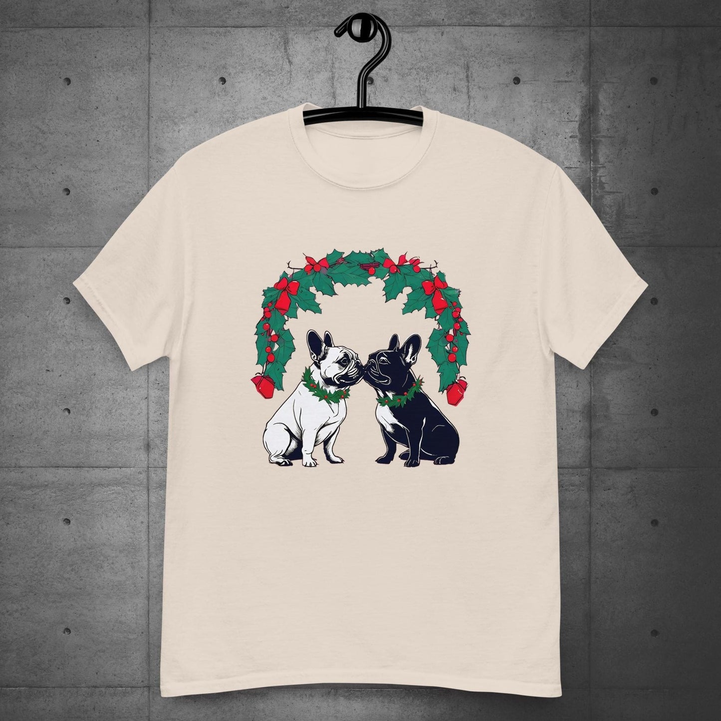 Celebrate the magic of the season with our “French Bulldog Christmas Romance Under Mistletoe” Unisex T-Shirt! Featuring two adorable French Bulldogs sharing a sweet holiday moment beneath a festive mistletoe wreath adorned with holly, berries, and bows, this design is perfect for dog lovers and Christmas enthusiasts alike. Whether you’re spreading holiday cheer or looking for the perfect gift, this charming t-shirt captures the love and joy of the season. Ideal for cozy gatherings, parties, or everyday festive fun, it’s a must-have for your holiday wardrobe!